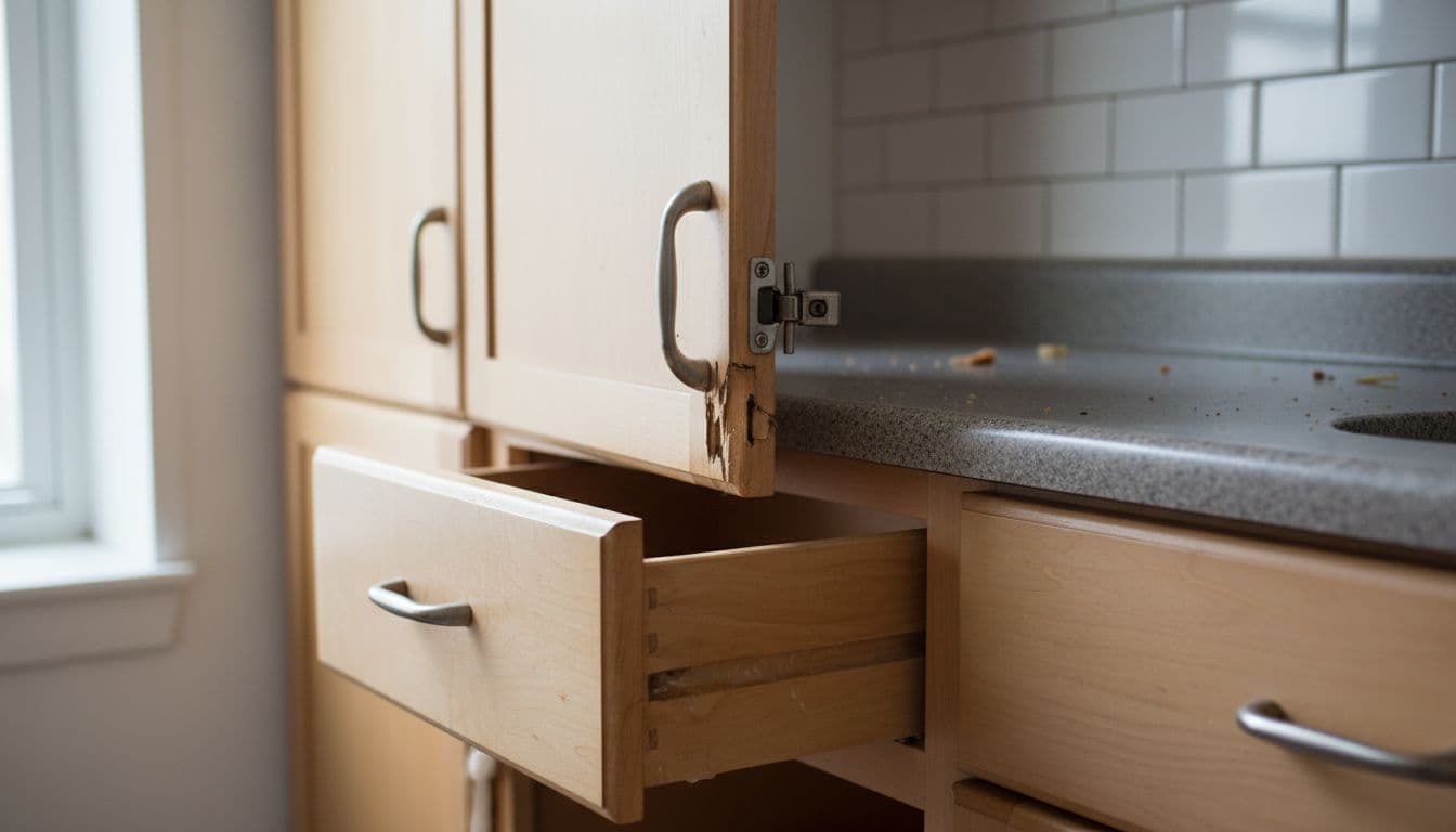 Drawers tell the same story. If one sticks, tilts, or jumps off track, the slides may be bent, dirty, or worn out. In many cases, a pro can adjust hinges, replace slides, tighten screws, and realign doors without replacing the cabinet box.